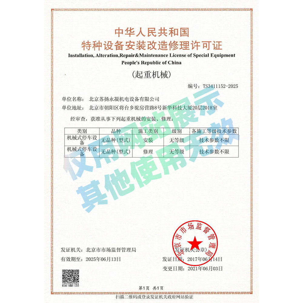 自2009年以來 ,便涉足于立體車庫并逐步将公司打造成立體停車和設備銷售、安裝、維保、維保、改造一條龍服務企業,擁有北京市市場管理局頒發的安裝、維修資質等多項榮譽。公司下設行政部、工程部、技安部、市場部和維保部,擁有工程師5名,立體車庫安裝維修人員和其他人員150餘名,特種作業操作人員均持證上崗。主營立體停車場管理、自走式立體車庫、自走式停車樓、立體車庫維修、立體車庫大修改造、機械車庫維保、大型起重設備維修等,業務範圍覆蓋山西、河北、沈陽、内蒙、陝西西安、新疆等全國各地。公司管理人員從事立體停車設備工作均在10年以上,有着豐富的工程質量和管理經驗,在北京地區安裝維修了大量的立體停車設備及裝飾裝潢工程,取得了用戶及生産廠家的一緻好評。